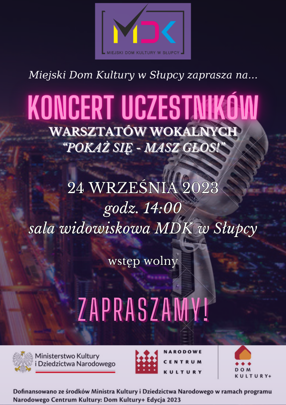 Miejski Dom Kultury w Słupcy zaprasza na KONCERT UCZESTNIKÓW Warsztatów Wokalnych „Pokaż się – Masz głos!”.
