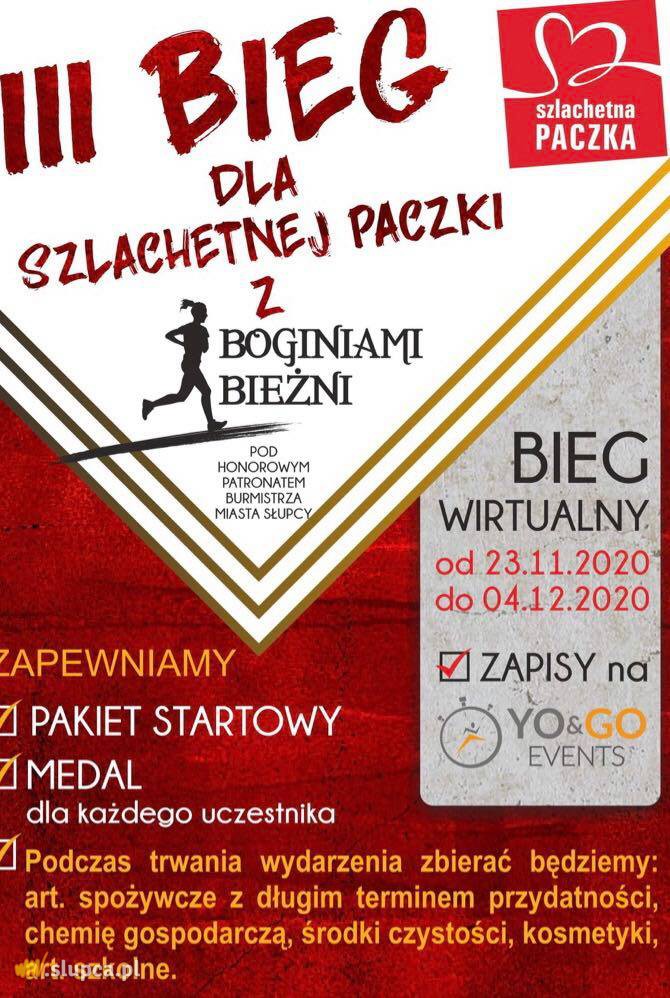 Boginie Bieżni zapraszają na III Edycje Biegu dla Szlachetnej Paczki, trwają zapisy. Jednakże z zaistniałą sytuacją i ograniczeniami postanowiliśmy zorganizować bieg wirtualnie. Tak jak w poprzednich latach będziemy zbierać dary tj. art spożywcze, chemię gospodarcza, art szkolne i wszystko to co uważacie, że może przydać się rodzinie w potrzebie. W wydarzeniu można wziąć udział w dowolnym miejscu, indywidualnie w terminie od 23 listopada do 4 grudnia 2020r. Wystarczy przebiec, przejść, przejechać na rowerze, wybrany przez siebie dowolny dystans (jednak nie mniej niż 1 km) i udokumentować go poprzez zapisanie aktywności na dowolnym urządzeniu rejestrującym trasę i czas. Zapisana aktywność na dowolnym urządzeniu z gps posłuży jako dowód odbycia biegu uprawniający do odbioru medalu oraz pakietu startowego. Zrzut zdjęcia z aktywności należy opublikować na swoim fb (post publiczny), lub na fb BoginieBieżni z hasztagiem #boginiedlaszlachetnej. W przypadku kiedy to uczestnik nie korzysta z portalu społecznościowego facebook, zrzut ekranu należy przesłać na email biuro@yogoecents.pl
