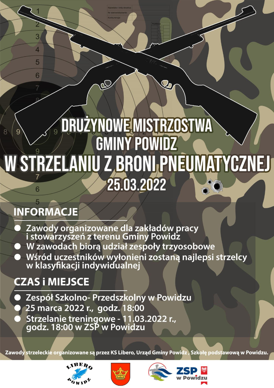 W imieniu organizatorów zapraszamy na Drużynowe Mistrzostwa Gminy Powidz w strzelaniu z broni pneumatycznej. Zawody w piątek 25 marca odbędą się w Zespole Szkolno-Przedszkolnym w Powidzu. Początek zaplanowano na godz.18.00. Zgłoszenia przyjmowane będą na godzinę przed turniejem i zakończą się 10 min. przed jego rozpoczęciem . Każdy zawodnik oddaje 12 strzałów po 6 do jednej tarczy – odlicza się dwa najsłabsze strzały. Czas strzelania: 8 minut dla osoby (po 4 minuty do każdej tarczy). Szczegółowy regulamin dostępny podczas strzelania treningowego oraz podczas zawodów. Info tel. 697997608 Zapraszamy