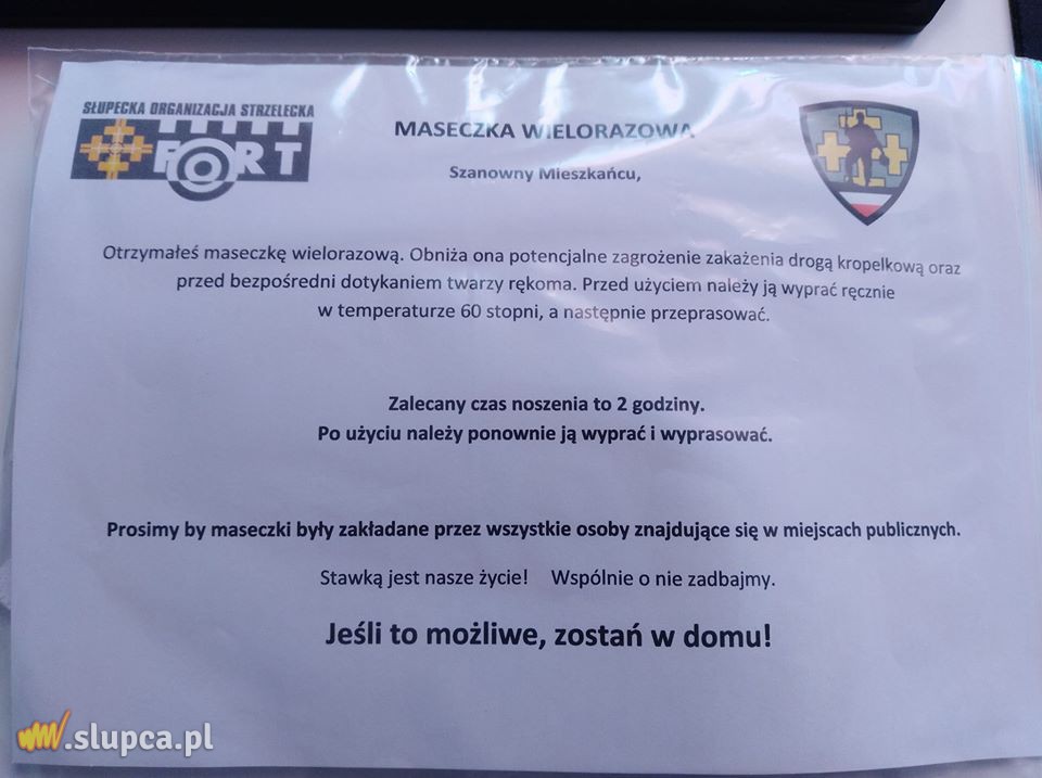 Słupecka Organizacja Strzelecka FORT zgodnie ze swoimi zapowiedziami, rozdała pierwszą partię maseczek. Jak czytamy na profilu stowarzyszenia w pierwszym dniu rozdano ponad 100 sztuk dla mieszkańców miasta Słupca.