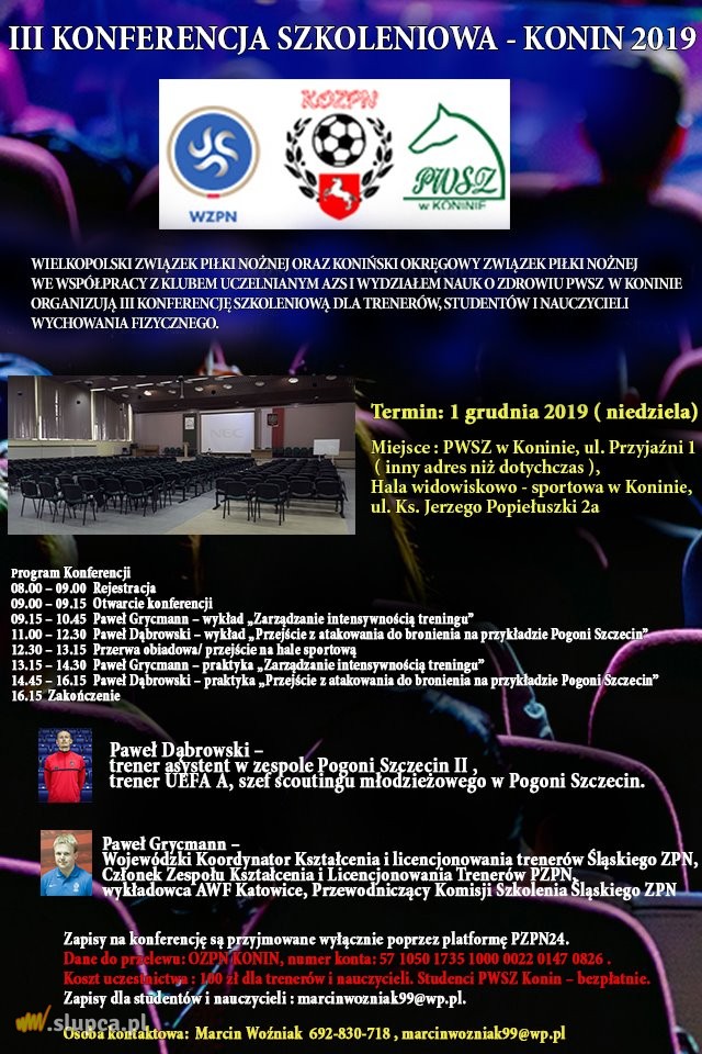 Zapraszamy wszystkich trenerów głodnych wiedzy i chcących uzyskać godziny do licencji. 1 grudnia 2019 w Koninie.