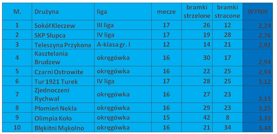 Runda wiosenna zbliża się wielkimi krokami – przed nami jeszcze kilka zestawień, która ukażą statystycznie rundę jesienną. Przygotowaliśmy ranking, w którym pod uwagę wzięliśmy liczbę goli na mecz. Liczymy gole, które padły w meczach każdej z drużyn OZPN Konin i dzielimy ją przez ilość spotkań drużyny, bez względu na to, czy są to bramki zyskane czy stracone – wyjaśnia Rafał Osajda, autor rankingu, Sekretarz Komisji ds. Marketingu OZPN Konin. W pierwszej dziesiątce rankingu znalazły się zespoły, w których meczach jesienią padało średnio przynajmniej pięć bramek. Info za koninskiopzn.pl