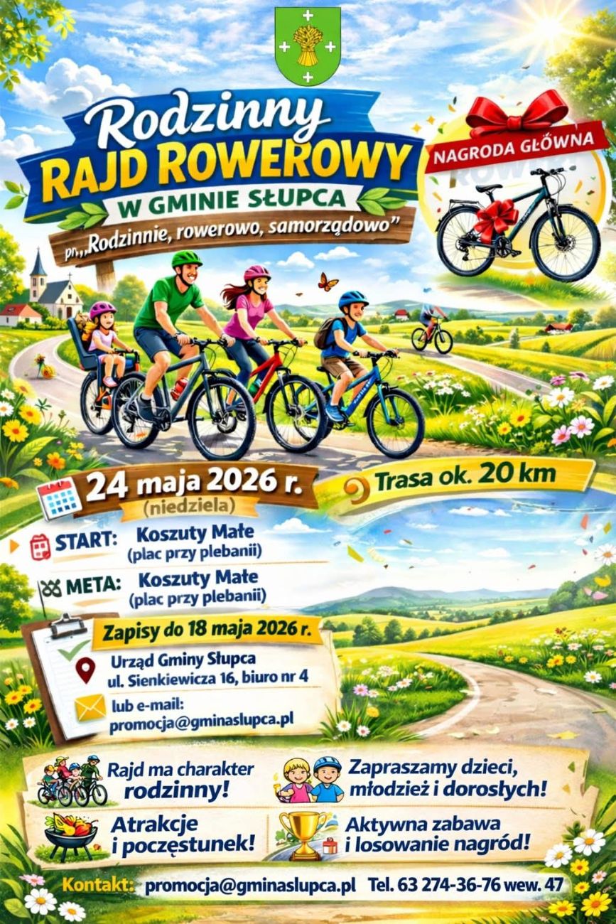 Wójt Gminy Słupca oraz KGW „Koszucianki” serdecznie zapraszają na Rodzinny Rajd Rowerowy w Gminie Słupca – „Rodzinnie, rowerowo, samorządowo”. Rajd odbędzie się w niedzielę 24 maja. Zapisy trwają do 18 maja.