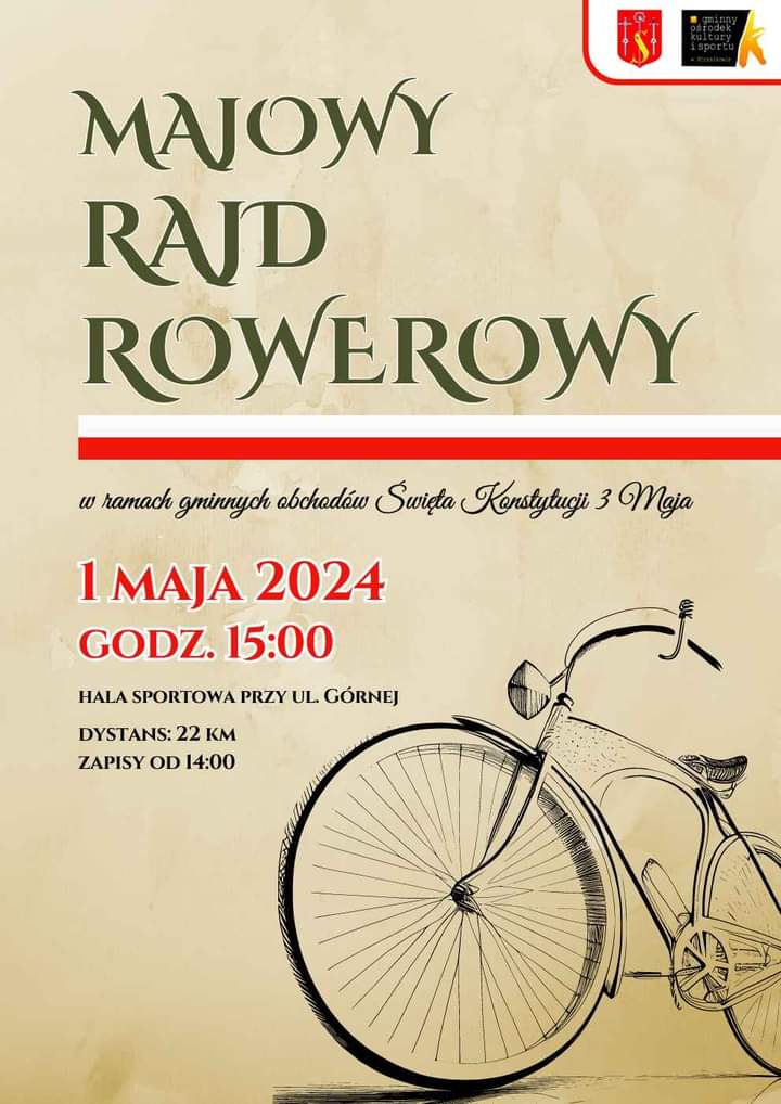 Gminny Ośrodek Kultury i Sportu w Strzałkowie zaprasza na majowy rajd rowerowy. Start: 1 maja o godz. 15:00 przy hali sportowej w Strzałkowie (ul. Górna). Zapisy od 14:00