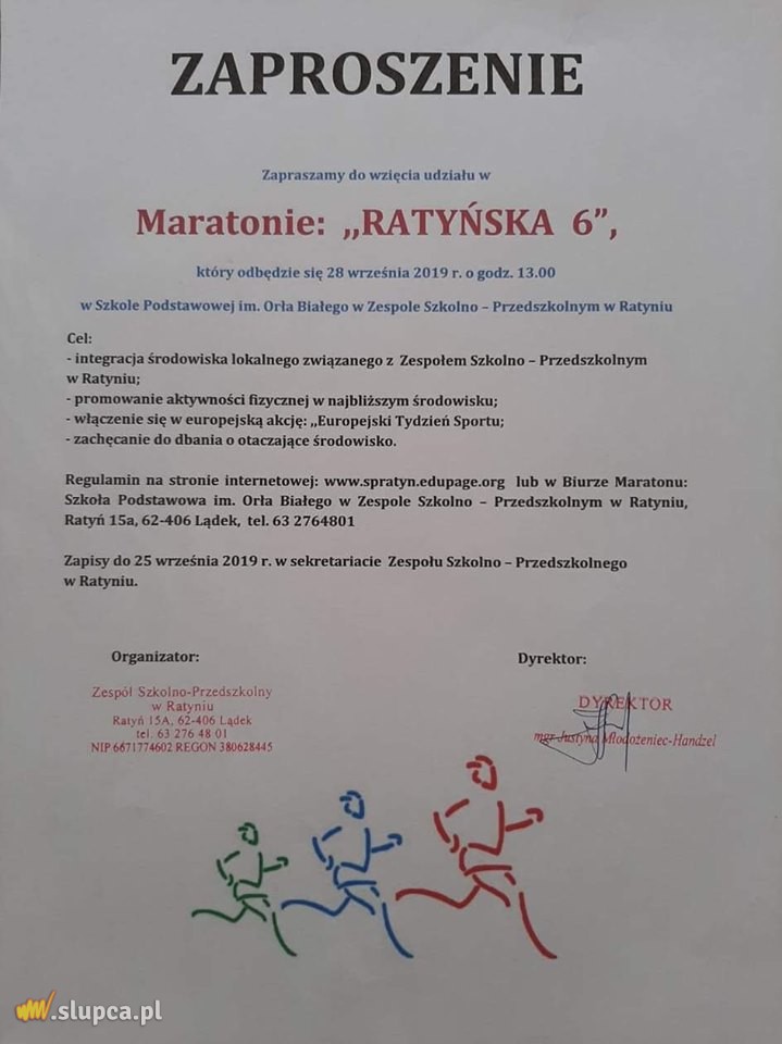 Zespół Szkolno Przedszkolny w Ratyniu zaprasza na „Maraton: Ratyńska 6”