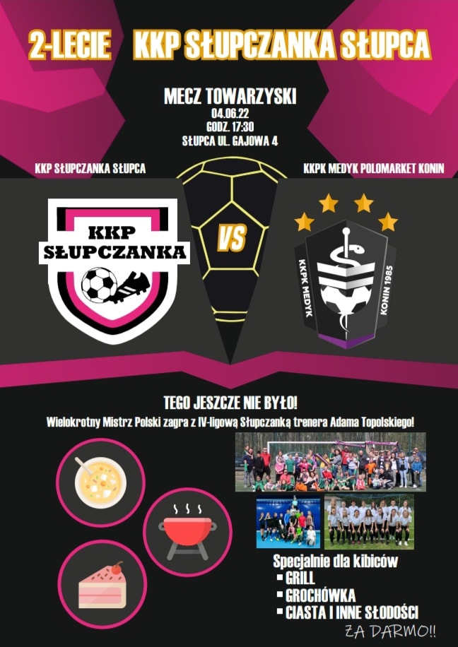 Wielokrotny Mistrz Polski – Medyk Konin uświetni drugie urodziny Kobiecego Klubu Piłkarskiego Słupczanka. Mecz towarzyski i impreza na którą zapraszamy miłośników piłki nożnej, odbędzie się w najbliższą sobotę na słupeckim stadionie.
