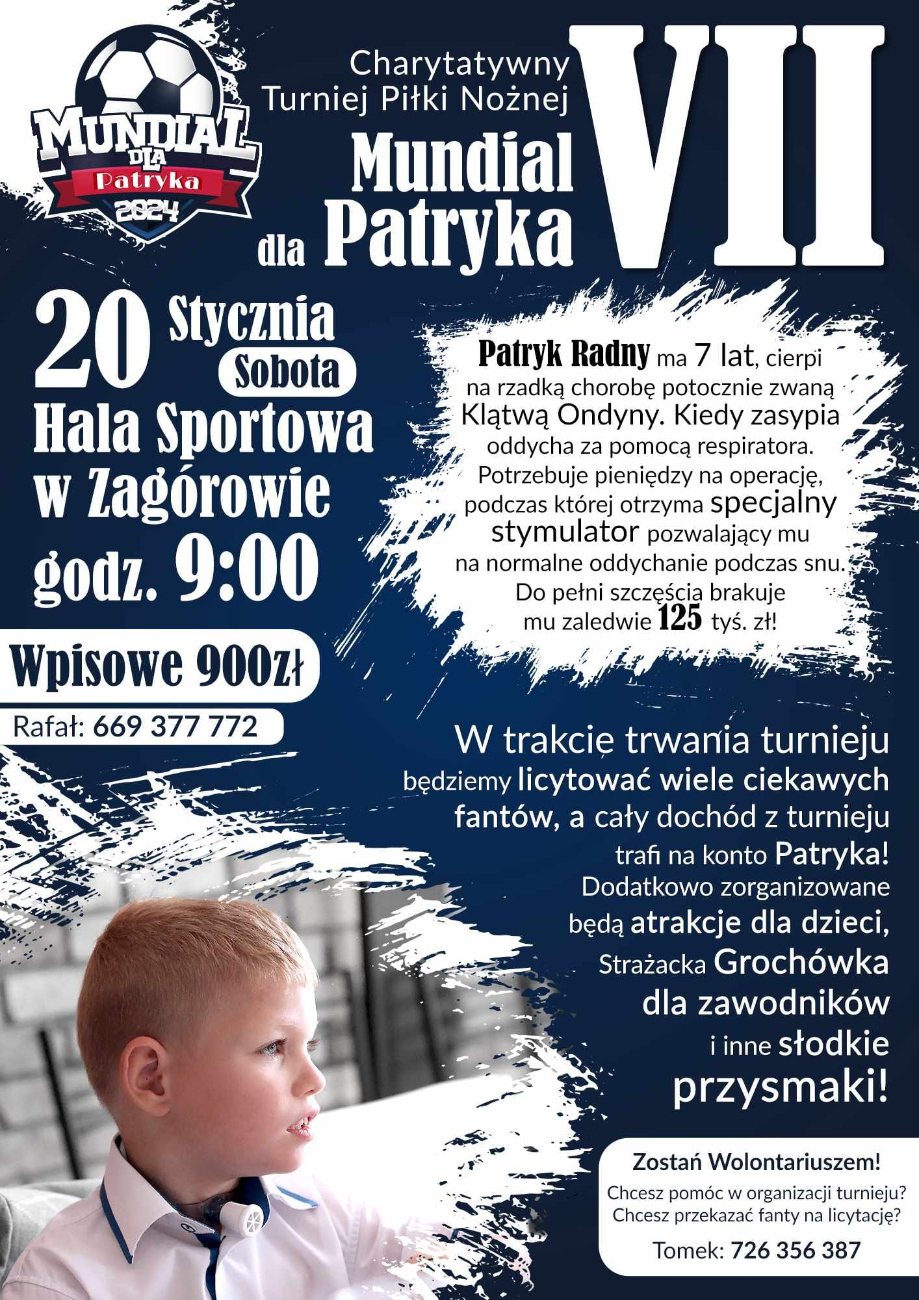 Wielkimi krokami zbliża się kolejny Mundial dla Patryka. VII edycja mundialu czyli Charytatywnego Turnieju Halowej Piłki Nożnej odbędzie się dokładnie za miesiąc 20 stycznia. Areną zmagań kolejny raz będzie hala w Zagórowie. Zapraszamy do udziału!