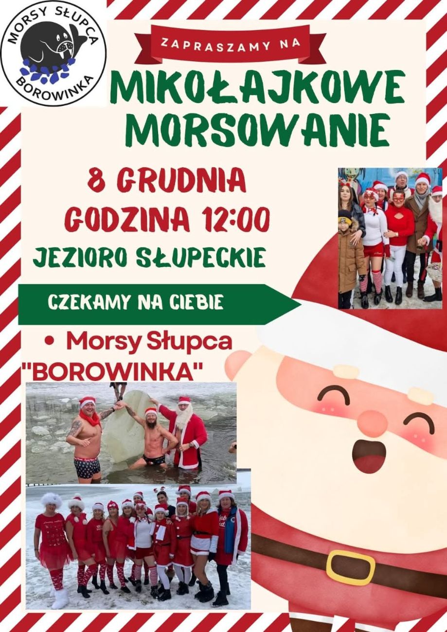 W imieniu organizatorów zapraszamy na sportowe Mikołajki. Morsy Borowinka Słupca zapraszają na Mała Mikołajkowa kąpiel. Jak piszą mile widziane atrybuty czerwone np.czapeczki stroje mikołajkowe itd. Więcej informacji na plakatach.
