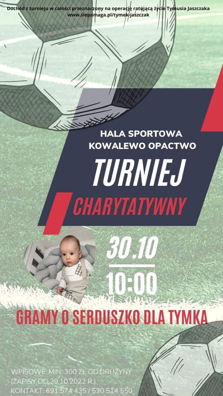 Gramy o serduszko dla Tymka i zapraszamy do udziału w halowym turnieju piłki nożnej. Ten odbędzie sie30 października w hali sportowej w Kowalewie Opactwie. Zapisy trwają do 29 października.