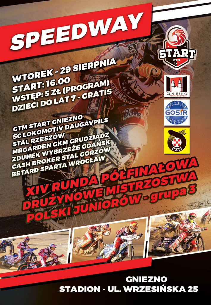 Już dzisiaj na torze w Gnieźnie odbędzie się XIV runda półfinałowa Drużynowych Mistrzostw Polski Juniorów. Początek o godzinie 16.00, wstęp na program w cenie 5 zł, dzieci do lat 7 wstęp wolny. W zawodach wezmą udział reprezentanci następujących zespołów: SC Lokomotiv Daugavpils, Stal Rzeszów, MRGARDEN GKM Grudziądz, Zdunek Wybrzeże Gdańsk, Cash Broker Stal Gorzów, Betard Sparta Wrocław oraz gospodarze – GTM Start Gniezno. Czerwono-czarne barwy reprezentować będą Patryk Fajfer, Damian Stalkowski oraz Jakub Osyczka.