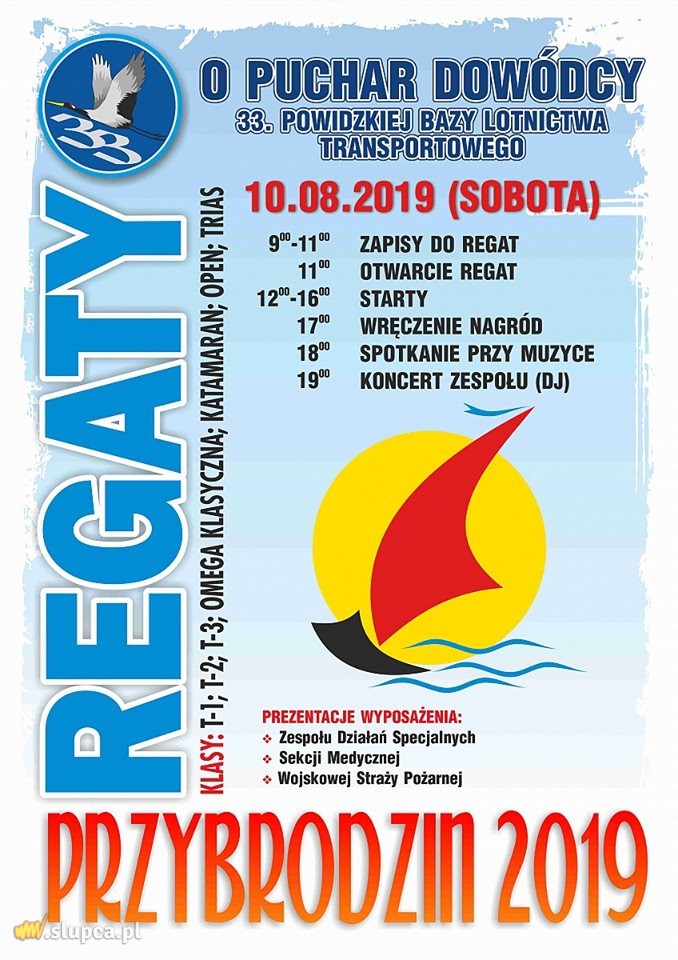 Dowódca 33 Bazy Lotnictwa Transportowego w Powidzu zaprasza w najbliższą sobotę 10 sierpnia 2019 r. na Regaty. Przedostatnie regaty w ramach Grand Prix Jeziora Powidzkiego rozegrane będą w klasach T1, T2, T3, Open, Katamaran, Trias oraz Omedze klasycznej. Zapowiada się wspaniała, wietrzna pogoda. Przybywajcie!