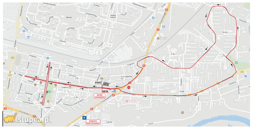 Start i meta zlokalizowane zostaną na parkingu Obiektu Sportowo-Rekreacyjnego Rondo. Po starcie zawodnicy pobiegną Alejami 1 maja, ulicą Dworcową, następnie skręcą w prawo znów w Aleje 1 maja. Na wysokości Zespołu Szkół im. Mikołaja Kopernika zawrócą. Następnie na wysokości Hotelu Konin skręcą w praw w ulicę Dworcową, by ponownie zawrócić przy Konińskim Domu Kultury. Znów wbiegną w Aleje 1 maja i pokonają je po prostej aż do ronda Solidarności. Następnie pobiegną ulicami Kardynała Stefana Wyszyńskiego, Wyzwolenia, Sosnową, Okólną, Zakole, 11 Listopada, Kolejową i Przemysłową. Zbiegając z ulicy Przemysłowej przebiegną ponownie pętlę Aleje 1 maja, Dworcowa i Aleje 1 maja aż do mety przy hali Rondo.