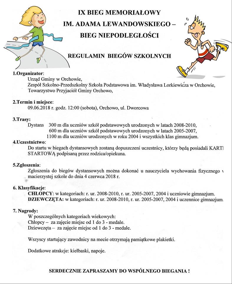 Pozostały tylko tylko trzy tygodnie do IX Biegu Memoriałowego im. Adama Lewandowskiego. Wydarzeniu jak zwykle towarzyszyć będą biegi szkolne. Zapraszamy 9 czerwca zarówno dorosłych jak i uczniów do aktywnego spędzenia tego dnia w Orchowie.