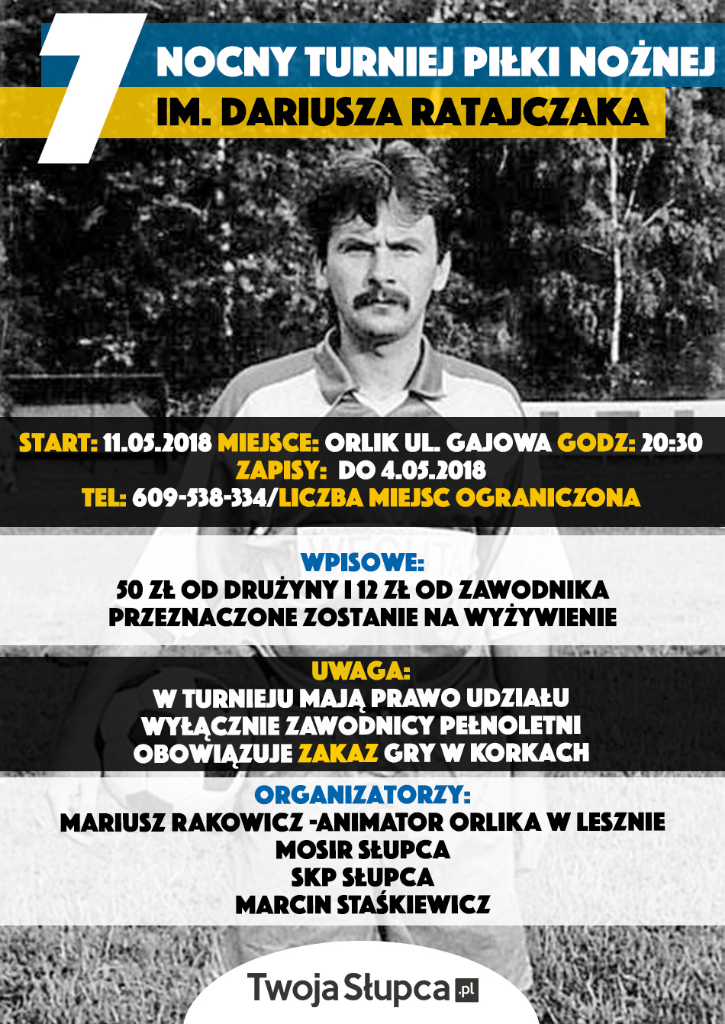 11 maja już po raz siódmy rozegrany zostanie Nocny Turniej Piłki Nożnej im. Dariusza Ratajczaka. Zapisy do turnieju przyjmowane są do piątku 4 maja pod numerem telefonu 609 538 334. Liczba miejsc jest ograniczona, do tej pory chęć udziału w turnieju zgłosiło osiem zespołów, w tym broniący tytułu team 2B Sklep Komputerowy.