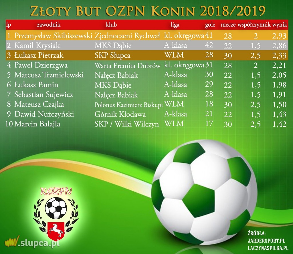 Marcin Balalja i Łukasz Pietrzak, którzy piłkarską jesień sezonu 2018/19 zaczynali w Słupeckim Klubie Piłkarskim, znaleźli się wysoko w rankingu Złoty But OZPN Konin. Pietrzak z dorobkiem 28 goli sklasyfikowany został na trzeciej pozycji, a Balalja, który dla SKP i Wilków Wilczyn strzelił łącznie 17 goli – zajął 10 miejsce. info za koninskiozpn.pl
