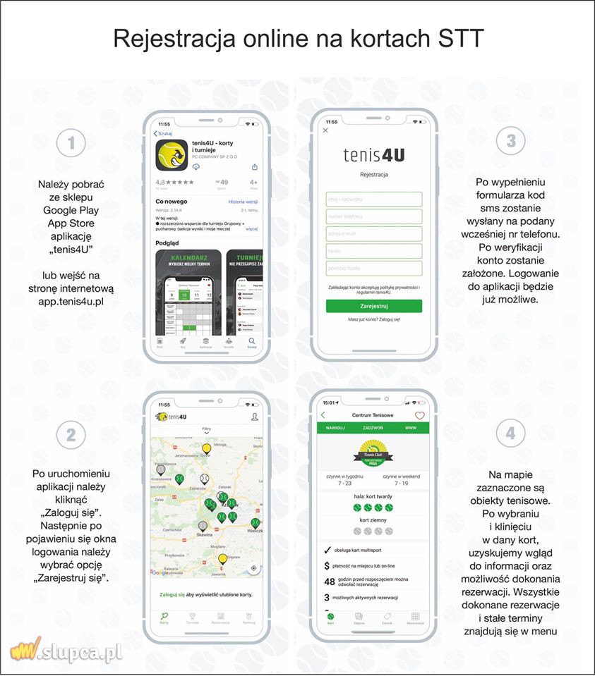 Drogie koleżanki i koledzy, idąc z duchem czasu wprowadzamy z dniem 1 lipca 2020 system rezerwacji kortów on line. Rezygnujemy całkowicie z grafika wywieszanego w gablocie. W tym celu należy pobrać i zainstalować na swoim smartfonie aplikację „tenis4U”. Następnie rejestrujemy i logujemy się w systemie zgodnie z poniższą infografiką. Jednocześnie najmniejszą jednostką rezerwacji staje się blok 30min. Wszelkie inne zasady oraz opłaty obowiązujące w STT pozostają bez zmian. Mamy nadzieję, że zmiany te będą dla wszystkich dużym ułatwieniem i przyczynią się do lepszego funkcjonowania STT. źródło Słupeckie Towarzystwo Tenisowe