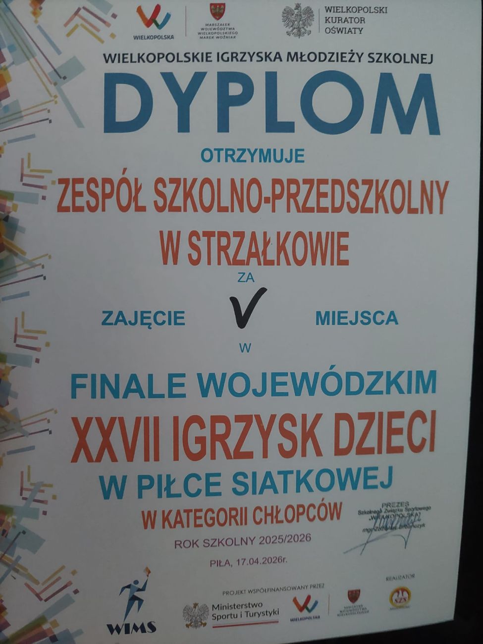 Dziś wracamy mega szczęśliwi z finałów Wielkopolski w Piłce Siatkowej które odbyły się w Pile – mówi Krzysztof Stefański nauczyciel wychowania fizycznego w ZSP Strzałkowo. Z losowania trafiamy do grupy A trafiając na Murowaną Goślinę, Piłę oraz Poznań. Ogrywamy w tie-breaku Murowaną Goślinę lecz przegrywamy po bardzo ciężkich meczach z Poznaniem oraz Piłą. Pozostaje nam walka o miejsce 5 z podpoznańskim Lusówkiem. Chłopcy dokonują tego w tie-breaku i zajmujemy ostatecznie miejsce piąte. To oczywiście ogromny sukces bo to piąte miejsce w Finale Wielkopolski. Dziś praktycznie w każdej drużynie napotykaliśmy siatkarzy z Kadry Wielkopolski. Więc to piąte miejsce jest tym bardziej cenne. Znowu okazuje się że szkółka z małej miejscowości Strzałkowo reprezentacja sportowych klas 5 i 6 robi wrażenie na finalistach. Jesteśmy z Was dumni. Brawo – podsumowywali trenerzy Paweł Pawłowski i Krzysztof Stefański.