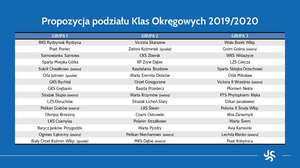 Zmiany wprowadzone przez PZPN w systemie zarządzania rozgrywkami otworzyły możliwość ujednolicenia formatu lig poszczególnych szczebli. Jedną ze zmian planowanych przez Wielkopolski ZPN jest zrównanie liczebności Klas Okręgowych do 16 drużyn każda. Podział dokonany na podstawie wyłącznie kryterium geograficznego obrazują załączone tabele oraz mapa w odnośniku. Poniższa wersja została uznana przez Wydział Gier i Ewidencji za optymalną i zarekomendowana do przyjęcia przez Zarząd Związku. Ostateczne decyzje zapadną 11 lipca. źródło, fot WZPN Poznań