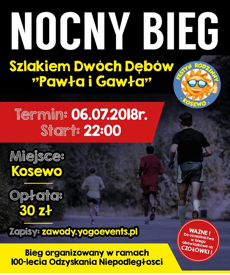 Pierwsze nocne wydarzenie w naszym regionie. 6-kilometrowa, crossowa, nocna trasa, na rozpoczęcie festynu rodzinnego w Kosewie. I Nocny Bieg Szlakiem Dwóch Dębów „Pawła i Gawła” odbędzie się 6 lipca. Start zaplanowano na godz. 22:00. Nie może Was zabraknąć!