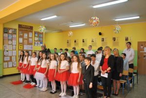 Na koniec apelu odbyło się wręczenie nagród w konkursie plastycznym „Polskie Symbole Narodowe”. Pierwsze miejsce zajął Miłosz Piński, a wyróżnienia otrzymali: Igor Witowski, Igor Kostyszyn i Zuzanna Andrzejewska. Uroczystość zakończyła się wspólnym zdjęciem społeczności szkolnej, a słodkim akcentem świętowania była degustacja deserów w kolorze biało-czerwonym.