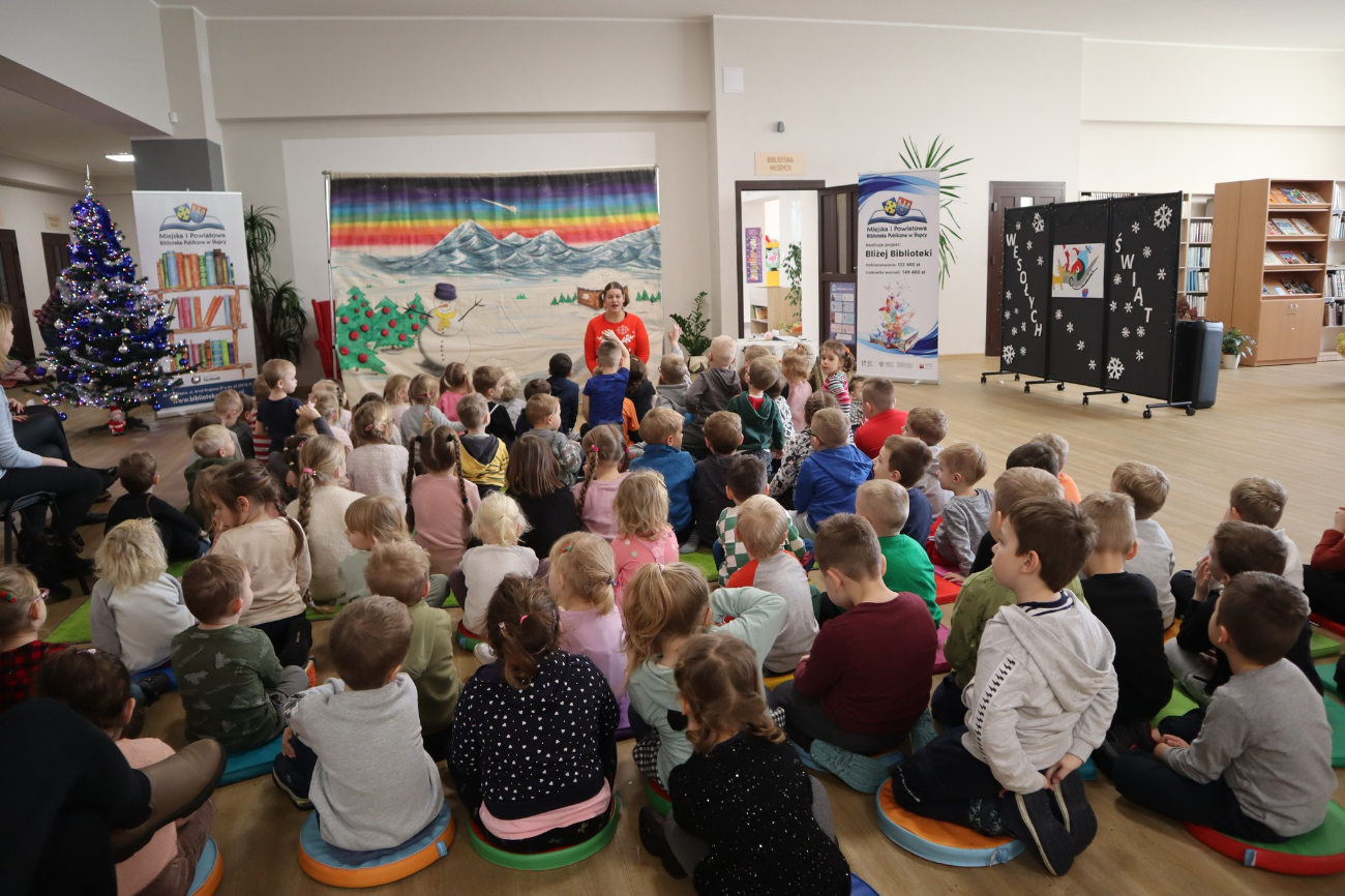 Co jeśli nie trafią bezpośrednio na Biegun i wszystkie prezenty są pomieszane – kto stoi za tym zamieszaniem? Winowajcą okazał się niesumienny i lekkomyślny Skrzat. Ostatecznie problem został szczęśliwie rozwiązany i dzieci mogą spokojnie oczekiwać na wymarzone prezenty. Dzieci z zaciekawieniem oglądały przedstawienie i brały czynny w nim udział, odpowiadając na zadawane im pytania – relacjonują pracownicy biblioteki.