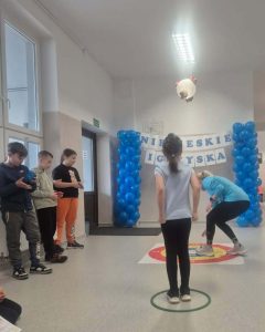 Z tej okazji nasza szkoła, na znak solidarności z osobami z autyzmem, włączyła się do ogólnopolskiej akcji Niebieskie Igrzyska organizowanej przez Instytut Wspomagania Rozwoju Dziecka w Gdańsku. Najważniejszym celem Niebieskich Igrzysk jest budowanie społeczności oraz przestrzeni przyjaznej dla osób z autyzmem i innymi niepełnosprawnościami. W dniu 09.04.2026 r. uczniowie klas 1-3 uczestniczyli w zorganizowanych przez panią Monikę Barańską w ramach Niebieskich Igrzysk, konkurencjach sportowych prowadzonych w formie gier i zabaw ruchowych. Zajęcia służyły integracji, uczyły zgodnej zabawy, a także doskonaliły sprawności motoryczne.
