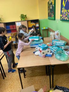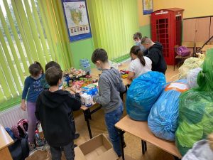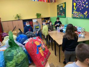 W dniach od 1 – 4 marca 2022r. przeprowadzono też w szkole zbiórkę produktów żywnościowych, środków chemicznych, kocy, pościeli, odzież dla dzieci i dorosłych.