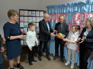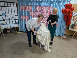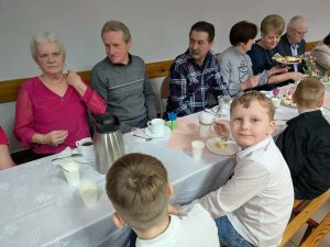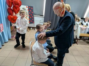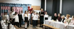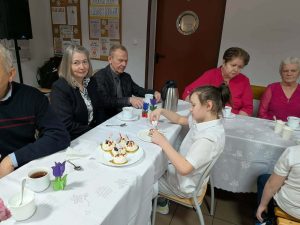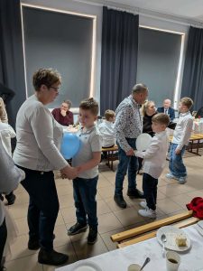 Po części artystycznej przyszedł czas na wspólne zabawy i konkursy. Uczniowie wraz ze swoimi dziadkami brali udział w różnorodnych grach i zabawach, które były zarówno wesołe, jak i edukacyjne. Były zagadki, konkursy, a także konkurencje ruchowe, które sprawdziły zwinność i spostrzegawczość uczestników. Dziadkowie świetnie bawili się razem z wnukami, a uśmiechy nie schodziły z ich twarzy. W trakcie tego wyjątkowego dnia mamy przygotowały dla wszystkich słodki poczęstunek.