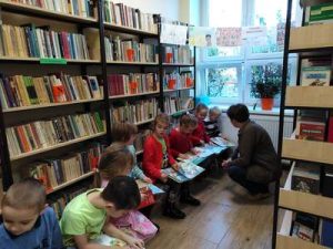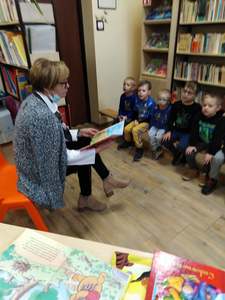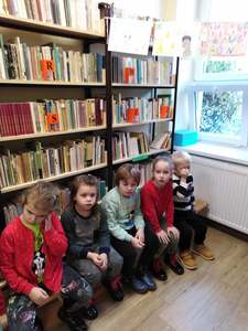 Wizyta dzieci z oddziału przedszkolnego w bibliotece szkolnej z okazji DNIA PLUSZOWEGO MISIA.