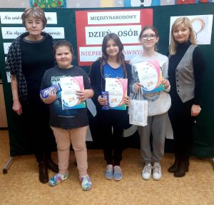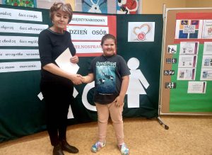 Święto zostało ustanowione przez Zgromadzenie Ogólne Narodów Zjednoczonych w 1992 roku. Ma ono na celu zwrócenie szczególnej uwagi na prawa osób z niepełnosprawnościami i zachęcanie nas wszystkich do działań na rzecz pełnej realizacji tych praw. Obchody Dnia Osób Niepełnosprawnych przypominają nam, że niepełnosprawni są wśród nas, że mają takie same potrzeby jak my, że chcą być traktowani na równi z pełnosprawnymi osobami. W ramach obchodów tego święta w naszej szkole przeprowadzone zostały zajęcia, których celem było upowszechnienie idei tolerancji, otwartości i szacunku dla innych. Dzieci z młodszych klas wzięły udział w ćwiczeniach, podczas których miały możliwość doświadczyć jak odbierają świat osoby niepełnosprawne, jakie mają bariery i ograniczenia w życiu. Ponadto poznawały alfabet języka migowego oraz Braille’a. Nasi uczniowie stwierdzili, że życie z niepełnosprawnością nie jest łatwe. Dla całej społeczności szkolnej przygotowana została tablica prezentującą „Savoir – vivre wobec osób z niepełnosprawnością”. Prezentacja uświadomiła jak należy zachowywać się w kontaktach z osobami niepełnosprawnymi. Dla wszystkich uczniów ogłoszony został konkurs plastyczny pt:” W jaki sposób mogę pomagać osobom niepełnosprawnym.” Zwycięzcami konkursu zostali:
