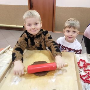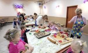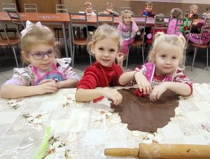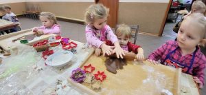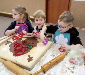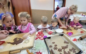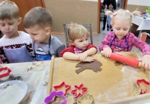 Przedszkolaki z zaangażowaniem wałkowały i wycinały z ciasta wybrane przez siebie kształty, stale będąc pod czujnym okiem troskliwych pań, gotowych pomóc małym kucharzom najlepiej jak tylko potrafią. Widząc radość z tworzenia słodkości, można było odnieść wrażenie, że wśród dzieci rośnie niejeden talent kulinarny. Z resztą, kto wie- może któreś z dzieci w przyszłości dołączy do Koła Gospodyń Wiejskich w Gółkowie. Spotkanie wprowadziło w radosny grudniowy czas.