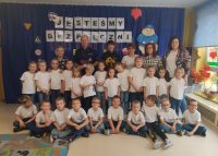 Policjanci mł.asp. Joanna Wolińska oraz mł.asp. Marcin Dębowski przybliżyli przedszkolakom zasady poruszania się pieszych po drogach, właściwego przechodzenia przez jezdnię. Przypomnieli o konieczności korzystania z fotelików i podkładek podczas jazdy samochodem oraz konieczności zapinania pasów bezpieczeństwa. Podczas spotkania poruszono temat noszenia elementów odblaskowych.