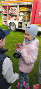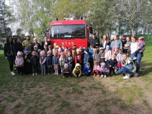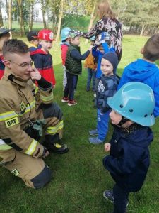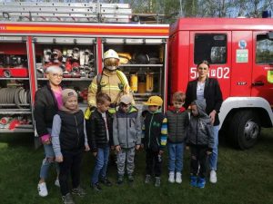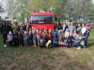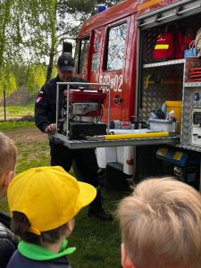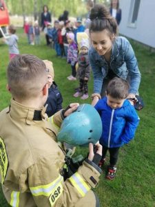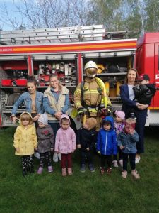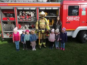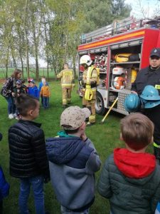 Goście w ciekawy sposób przybliżyli przedszkolakom specyfikę pracy Strażaka jednocześnie prezentując strój i podręczny sprzęt. W trakcie spotkania dzieci dowiedziały się, że praca Strażaka nie polega tylko na gaszeniu pożarów, ale również na udzielaniu pomocy podczas wypadków samochodowych oraz asyście podczas różnych akcji. Strażacy zapoznali przedszkolaków z sytuacjami, w których należy wezwać Straż Pożarną, z zasadami prawidłowego zachowania się podczas pożaru. Dzieci z bliska mogły podziwiać wóz strażacki, wyposażenie jakim dysponują Strażacy podczas swojej ciężkiej i odpowiedzialnej pracy. Dzieci przymierzały hełm strażacki, wchodzili do wozu, gdzie mogli poczuć się jak prawdziwi Strażacy. Wizyta Strażaków utrwaliła wiedzę przedszkolaków w zakresie bezpieczeństwa. Strażacy zaprezentowali pokaz lania wody.