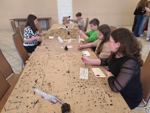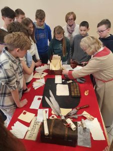 Podczas zajęć dzieci poznały historię powstania papieru, własnoręcznie czerpały papier artystyczny, odciskały pieczęci lakowe, poznały tajniki kaligrafii oraz sztuki pisania gęsim piórem. To była bardzo interesująca lekcja. SP)