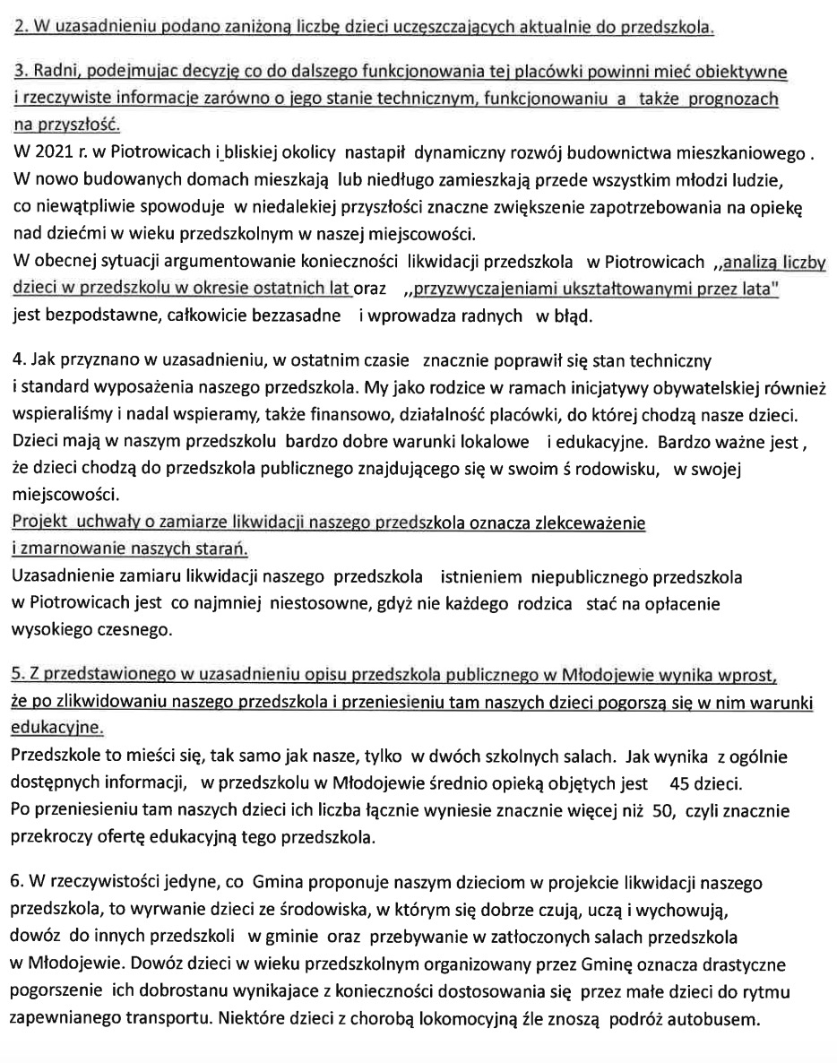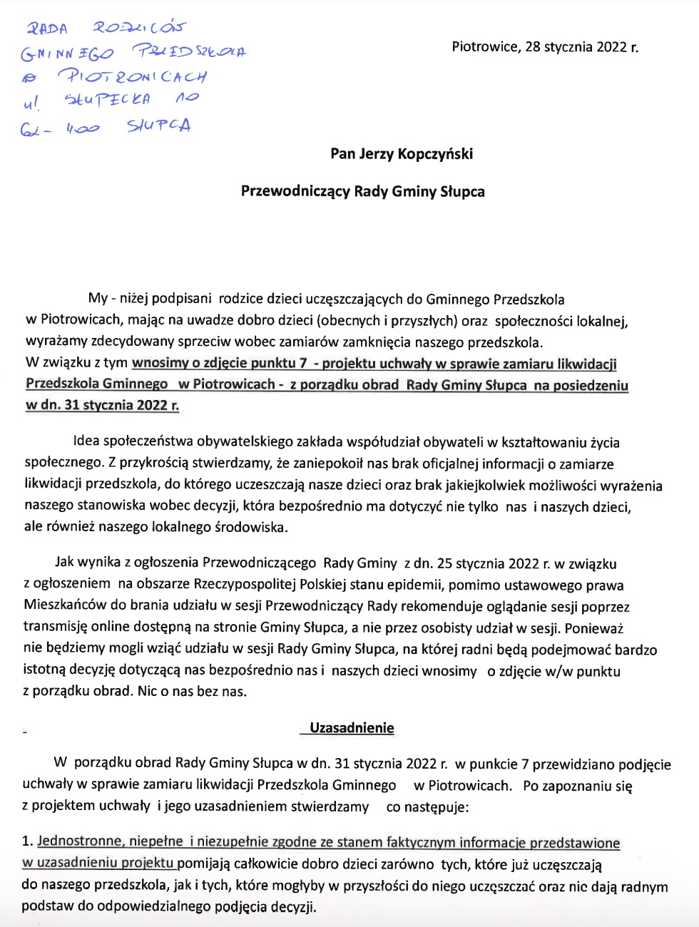 Na dzisiejszej sesji radni większością głosów zdecydowali o zamiarze likwidacji przedszkola w Piotrowicach. O utrzymanie placówki walczyli rodzice uczęszczających tam dzieci. Poniżej przedstawiamy ich pismo złożone na ręce przewodniczącego rady. Powyżej stanowisko w tej sprawie wójt Grażyny Kazuś (wypowiedź nagraliśmy w piątek, dzień po posiedzeniu komisji).