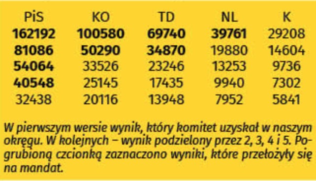 W podziale mandatów mogli zatem uczestniczyć: Prawo i Sprawiedliwość, Koalicja Obywatelska, Trzecia Droga, Nowa Lewica i Konfederacja. Tutaj zastosowanie miała wspomniana metoda d’Hondta. Najprościej mówiąc polega ona na tym, że liczbę głosów oddanych na każdy komitet dzieli się kolejno przez 1, 2, 3, 4, itd. Następnie z zestawu tak otrzymanych wyników wybiera się 9 największych liczb, bo tyle mandatów było do obsadzenia w naszym okręgu. Szczegółowe wyniki każdego komitetu podzielone przez kolejne liczby przedstawia zamieszczona obok tabela. Pogrubioną czcionką zaznaczono 9 najwyższych liczb.