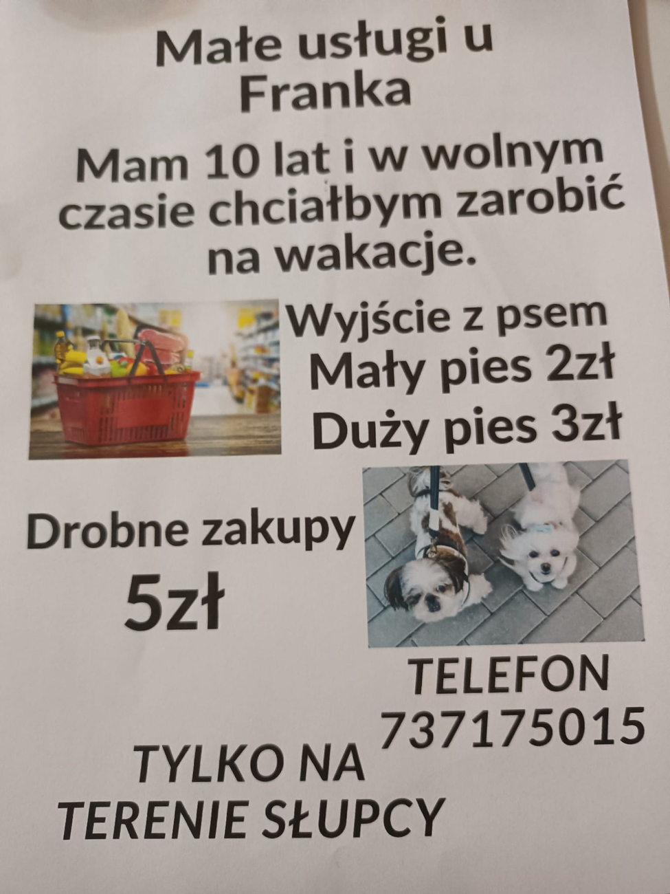 Ogłoszenie, które na facebooku udostępniła wczoraj jego mama robi furorę wśród słupczan. Ludzie nie tylko udostępniają post i komentują, chwaląc przedsiębiorczość młodego słupczanina, ale dzwonią już z konkretnymi zleceniami. – Dziś robiłem już zakupy jednej pani, zadzwoniła z ogłoszenia – mówi Franek i czeka na kolejne zlecenia. Działa bardzo profesjonalnie. Dostaje listę zakupów, za swoje pieniądze ją realizuje i dostarcza pod wskazany adres. Inkasuje wydaną na zakupy kwotę plus dolicza niewielką prowizję. W swojej ofercie ma też wyprowadzanie psów na spacer. Więcej o przedsiębiorczym 10-latku przeczytacie Państwo w najbliższym wydaniu Kuriera. Tymczasem zachęcamy do skorzystania z jego usług.