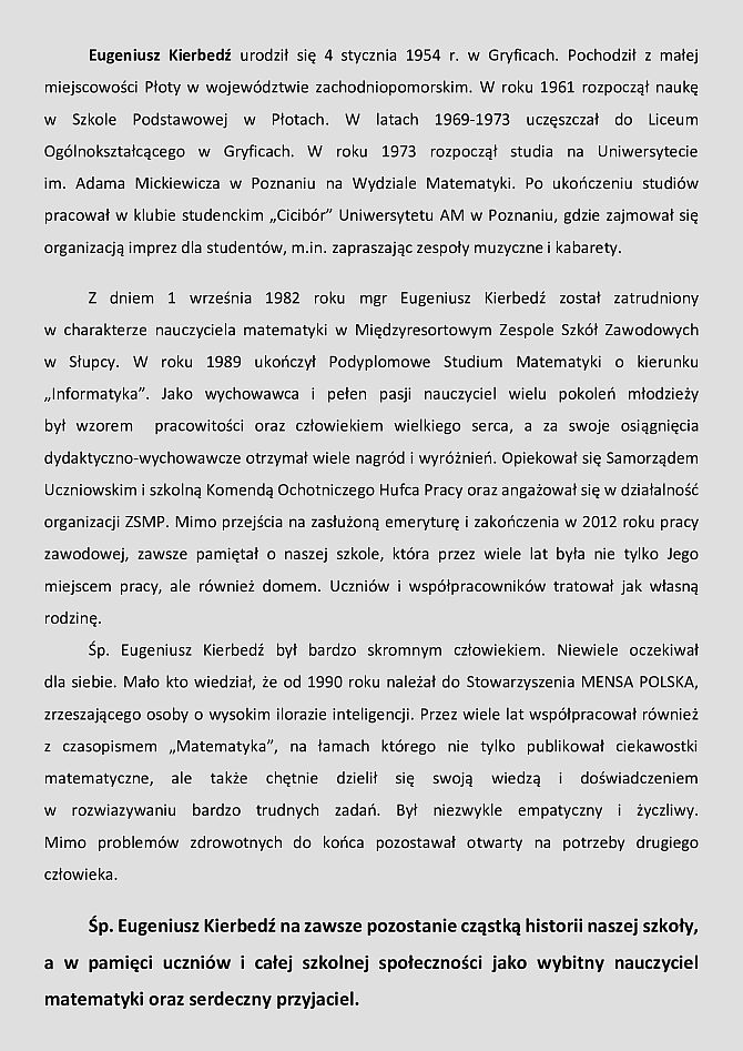 Dziś Zespół Szkół Zawodowych w Słupcy poinformował o śmierci wieloletniego nauczyciela Eugeniusza Kierbedzia. Na stronie szkoły zamieszczono również jego krótki życiorys. Przytoczono m.in. fakty, o których nie wszyscy wiedzieli.