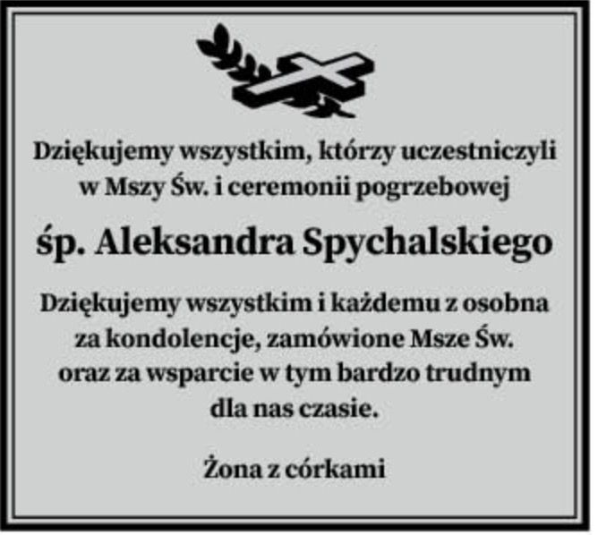 Pochodził z Rozalina, ale większość dorosłego życia związał ze Słupcą. Wcześniej jednak przez kilka lat, zaraz po ślubie mieszkał w Giewartowie, skąd pochodzi jego żona Halina. Wychowali dwie córki: Magdalenę i Joannę, doczekali się dwójki wnucząt (9-letni Tymek i 5-miesięczna Michalinka). Właśnie rodzina dla pana Aleksandra zawsze była najważniejsza. Zawodowo, przez lata związany był z Mostostalem. Tam zaangażował się w działalność polityczno-społeczną, stanął na czele komitetu zakładowego. Pod koniec lat 90., po reformie administracyjnej w Polsce zmienił pracę. Został zatrudniony w słupeckim starostwie. W tym czasie mocno zaangażował się w działalność samorządu miejskiego w Słupcy. W kadencji 1998-2002, kiedy burmistrzem był Jerzy Mikołajewski, Aleksander Spychalski zasiadał w zarządzie miasta. Po odejściu ze starostwa pan Aleksander pracował w sektorze prywatnym, gdzie zajmował się realizacją inwestycji, głównie wodno-kanalizacyjnych. Przez około 30 lat społecznie działał na rzecz Spółdzielni Mieszkaniowej w Słupcy, pełniąc funkcję przewodniczącego rady nadzorczej. Do końca życia angażował się w działalność słupeckiej Lewicy. – Od zawsze miał serce po lewej stronie i nigdy swoich poglądów nie zmienił. Zawsze działał prospołecznie, wielu ludziom pomógł. Był jednym z filarów słupeckiej Lewicy. Są ludzie, których trudno zastąpić i Olek właśnie do tego grona należał – wspomina Henryk Janiak, przewodniczący Rady Powiatowej Nowej Lewicy w Słupcy. – Jeszcze w piątek był u mnie w biurze, omawialiśmy sprawy związane z zbliżającymi się wyborami. Posiedzieliśmy dobre 1,5 godziny. Ostatni raz rozmawialiśmy w środę rano – dodaje. Tego dnia pan Aleksander nagle źle się poczuł i trafił do szpitala. Kilka godzin później zmarł. W minioną sobotę spoczął na cmentarzu w Giewartowie. Jego bliskim składamy wyrazy współczucia.
