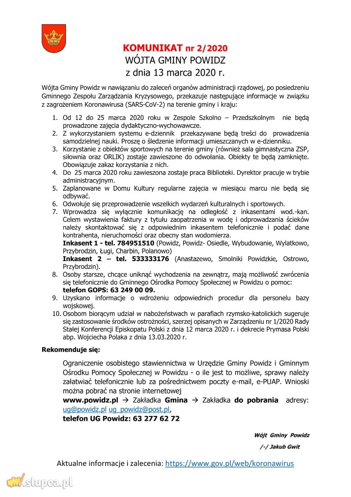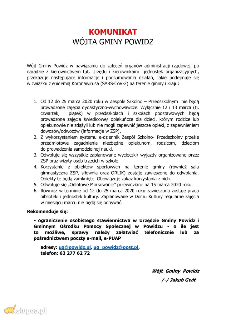 W Urzędzie Gminy w Powidzu odbyło się posiedzenie Gminnego Zespołu Zarządzenia Kryzysowego poszerzonego o dodaktowych uczestników m.in. Proboszcza Parafii Powidz i przedstawicieli strony wojskowej. Tematem spotkania było omówienie działań związanych z przeciwdziałaniem zagrożenia koronawirusem na terenie Gminy Powidz. Po posiedzeniu wójt Powidza Jakub Gwit wydał dwa ważne komunikaty, które publikujemy poniżej.