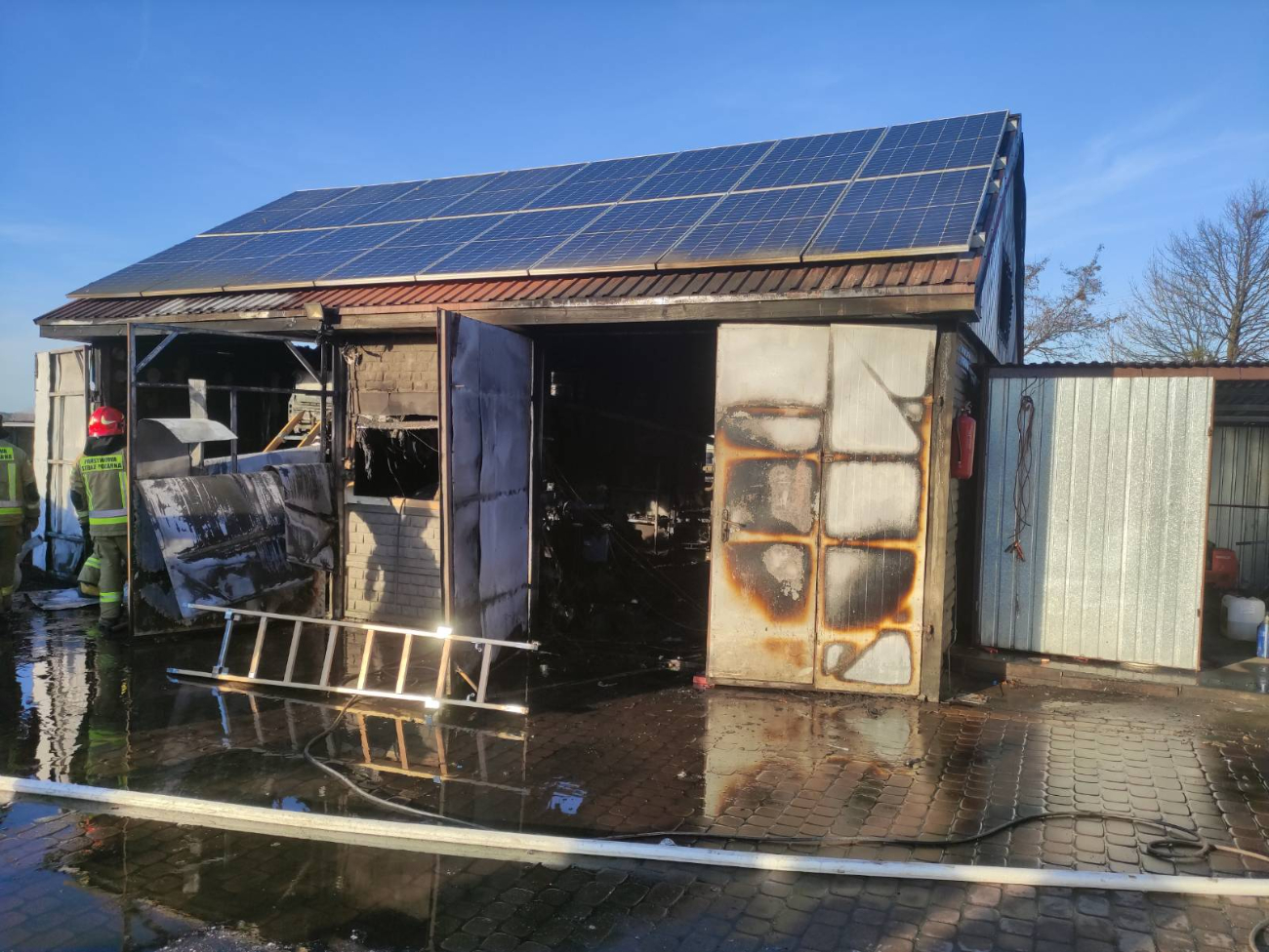 Zgłoszenie o pożarze wpłynęło w sobotę, 12 lutego ok. godz. 14.30. – Po przybyciu na miejsce stwierdzono całkowicie objęty pożarem warsztat samochodowy. Budynek posiadał instalację fotowoltaiczną, natomiast w środku na podnośniku znajdował się samochód osobowy oraz przy wejściu do warsztatu butla z gazem technicznym. Strażacy zabezpieczeni w sprzęt ochrony układu oddechowego podali wodę na palące się wyposażenie warsztatu. Jednocześnie schładzano wodą butlę z gazem technicznym.