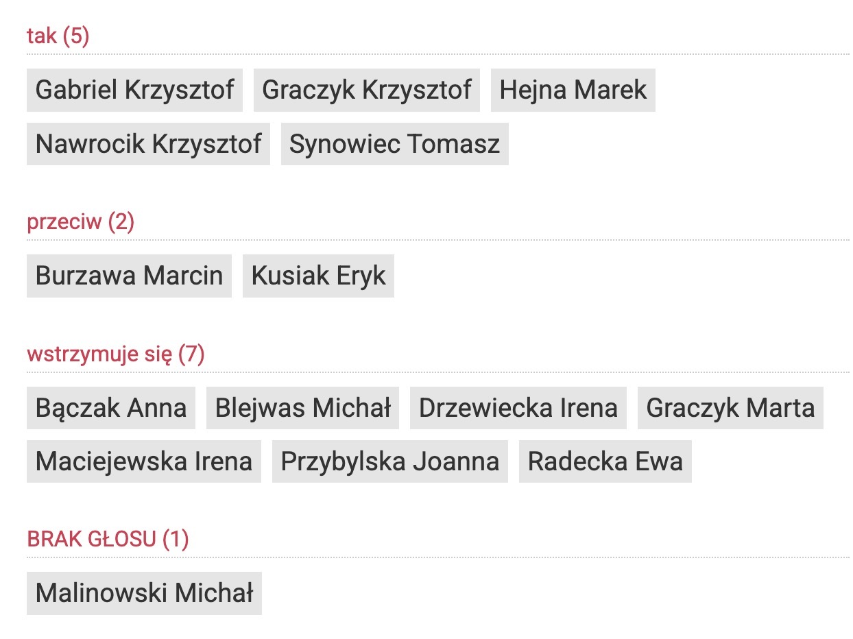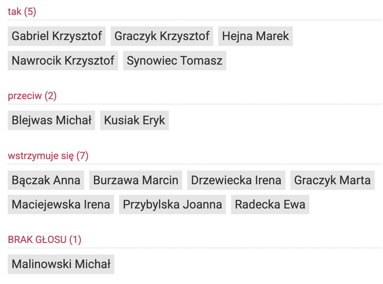 Za wyróżnieniem Małgorzaty Wolskiej zagłosowało 10 radnych, nikt nie był przeciw, czworo radnych wstrzymało się od głosu. Zdecydowanie bardziej radni byli podzieleni w przypadku dwóch kolejnych głosowań. Za przyznaniem Złotych Strzałek Łukaszowi Kuropaczewskiemu zagłosowało tylko pięciu radnych. Dwóch było przeciw, a aż siedmioro wstrzymało się od głosu.