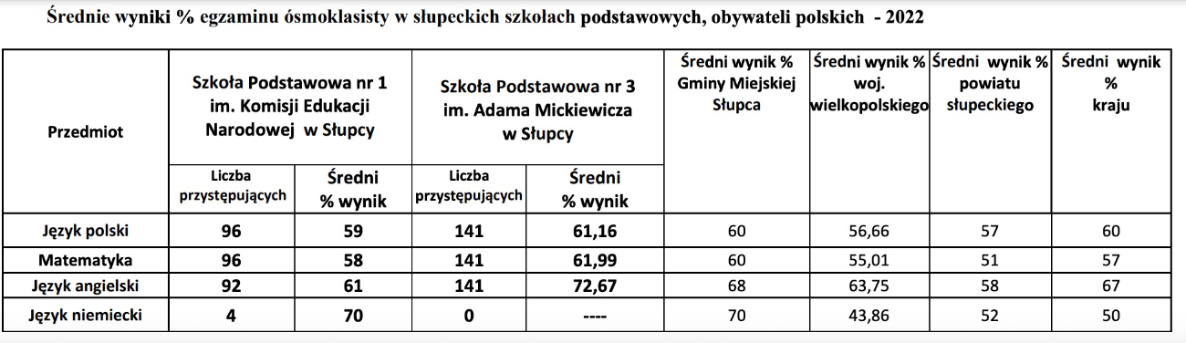 Znamy wyniki egzaminu ósmoklasistów. W Słupcy lepiej poradzili sobie z nim uczniowie Trójki, który osiągnęli wyższe średnie wyniki z języka polskiego, matematyki i języka angielskiego. Szczegółowe wyniki przedstawia poniższa tabela, przygotowana przez Elżbietę Kordylewską ze słupeckiego magistratu.