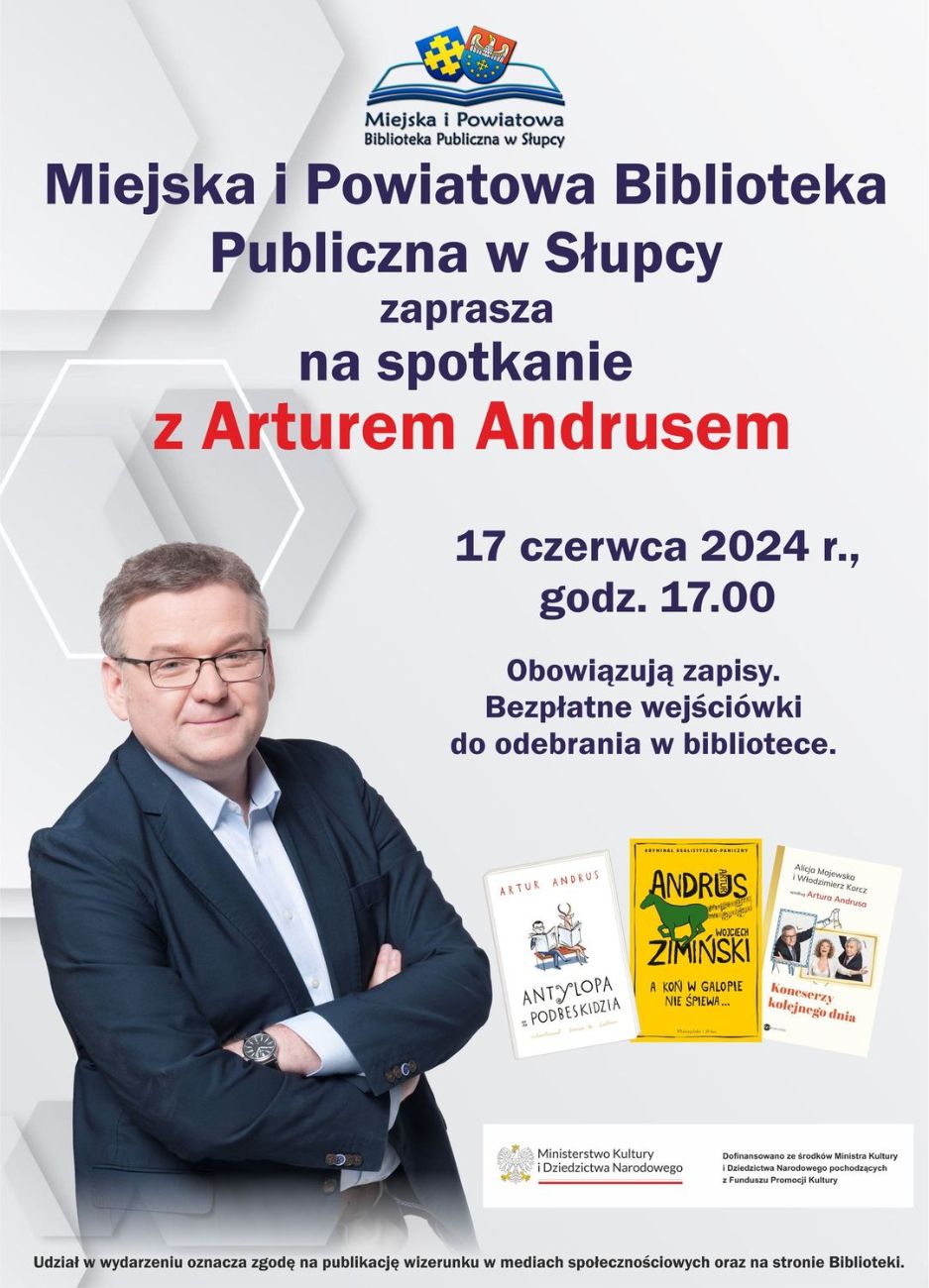 Artur Andrus – dziennikarz, prezenter telewizyjny i radiowym, aktor, pisarz, poeta, autor tekstów piosenek, piosenkarz, artysta kabaretowy i konferansjer wkrótce odwiedzi Słupcę. 17 czerwca będzie gościem biblioteki.