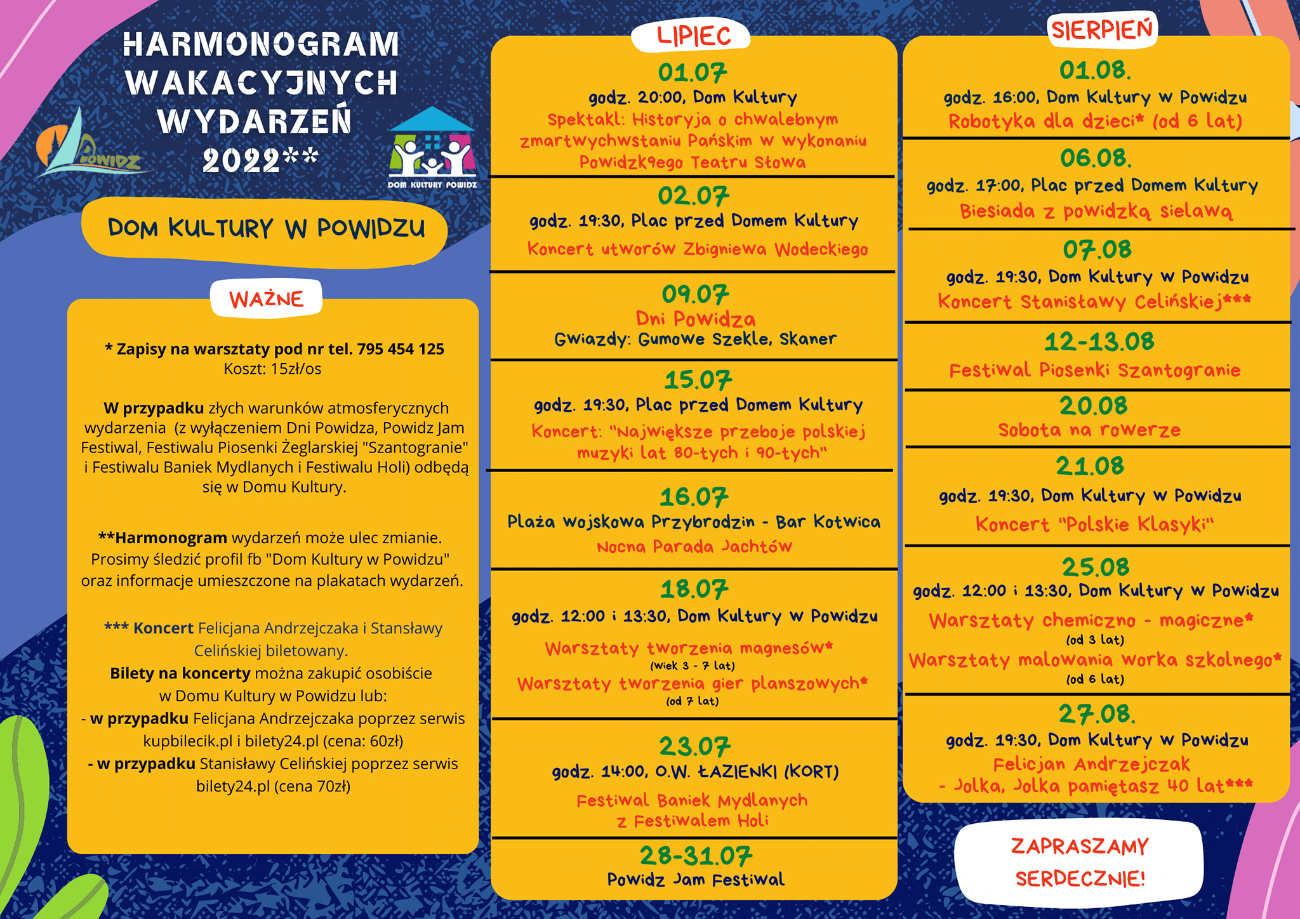 Dom Kultury w Powidzu opublikował harmonogram wydarzeń na cały sezon letni w Gminie Powidz. Zapowiada się mnóstwo koncertów i warsztatów. Szczegóły na plakacie poniżej.