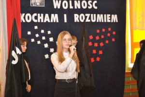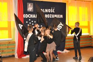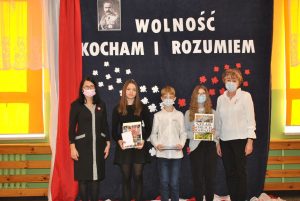Także słowa ostatniej piosenki „Wywalczona, Okupiona krwią, Bliska mojemu sercu, Zadana mi na zawsze, Umiłowana, Piękna i szlachetna Polska” skłoniły uczniów do refleksji nad naszą miłością do ojczyzny. Wiadomo, iż w dzisiejszych czasach istnieje potrzeba pielęgnowania polskiej historii i tradycji, poszanowania narodowych symboli, kształtowania poczucia solidarności z rodakami i pamięci o tych, którzy kiedyś żyli i walczyli o wolną Polskę. Uroczyste obchody zakończyły się ogłoszeniem wyników konkursów i wręczeniem nagród przez panią dyrektor Danutę Samul. W kategorii klas IV-V w konkursie „Czy znasz polski hymn narodowy?” nagrodzono uczniów z klasy V: Izabelę Wrzesińską, Dawida Drzewieckiego oraz Damiana Kukulskiego. Natomiast w konkursie „Droga do wolności” zwycięzcami okazali się uczniowie z klasy VII: Marta Roszak (I miejsce), Kinga Kamińska (II miejsce) oraz Wojciech Piński (III miejsce). Nagrodzonym gratulujemy i życzymy kolejnych sukcesów!!!