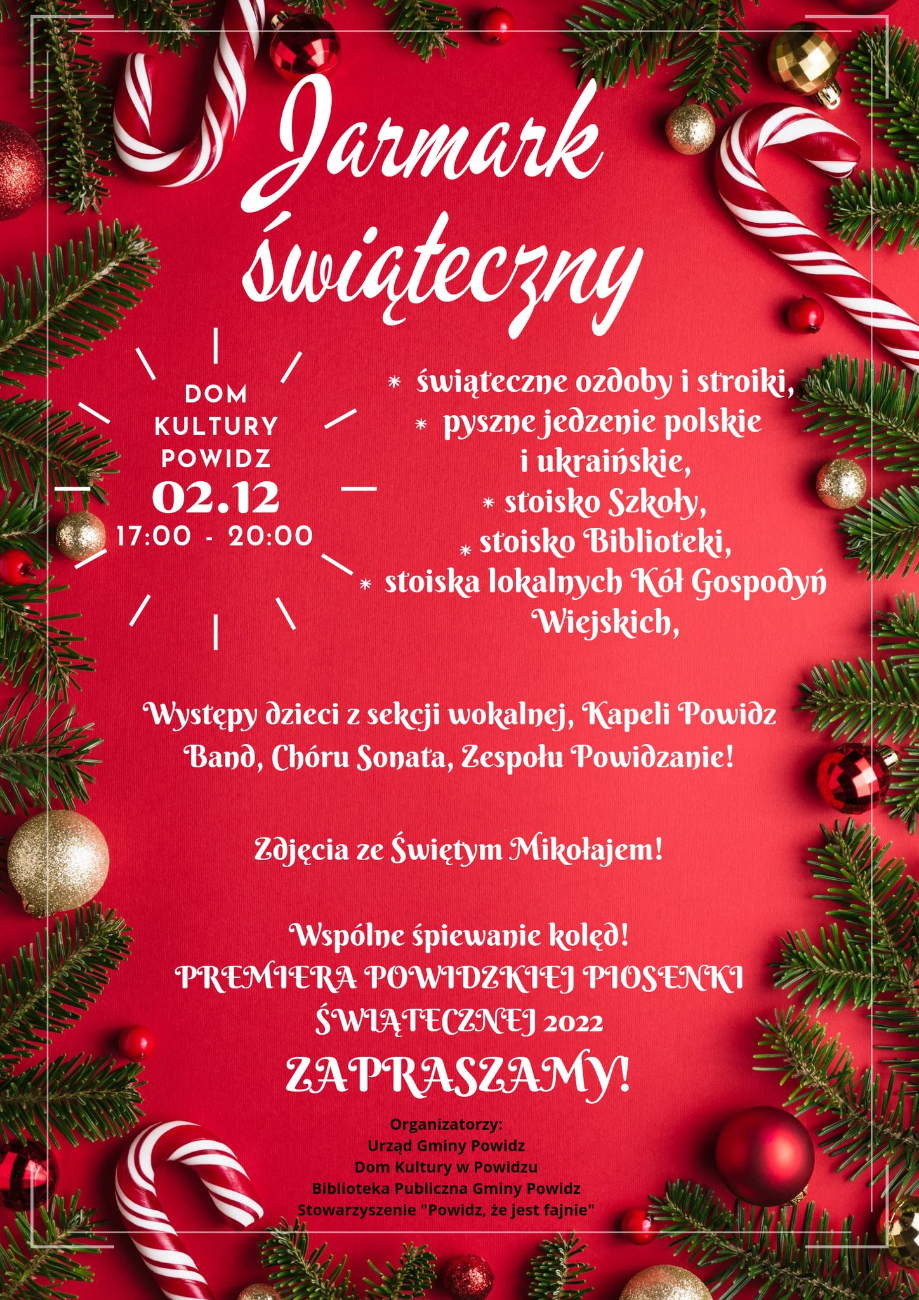 Organizatorzy zdecydowali, że ze względu na niepewne warunki atmosferyczne – wydarzenie będzie w Domu Kultury, a nie pod chmurką. Swoje stoiska i potrawy zaprezentują panie z miejscowych Kół Gospodyń Wiejskich, a także obywatelki Ukrainy, które chcą pokazać swoje tradycyjne przysmaki. Pojawią się również osoby prywatne i przedsiębiorcy, u których będzie można zakupić stroiki, czy świąteczne prezenty, a także miejscowa biblioteka, która wystawi się z książkami. Podczas jarmarku nie zabraknie artystycznego akcentu, czyli wspólnego śpiewania kolęd wraz z animatorką Barbarą Smółką, kapelą Powidz Band, chórem Sonata, czy zespołem „Powidzanie”. Najmłodsi będą mogli wziąć udział w świątecznych warsztatach i wysłać list do świętego Mikołaja. Wydarzenie zaplanowano na 2 grudnia. Powstaje przy udziale Urzędu Gminy, Domu Kultury i Biblioteki Publicznej Gminy Powidz, a także Zespołu Szkolno-Przedszkolnego.