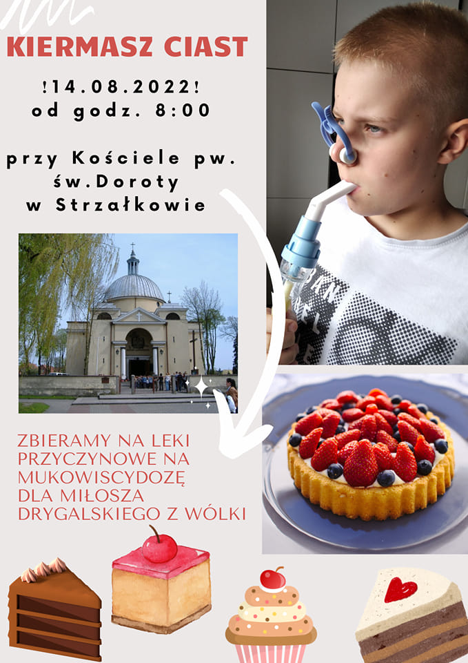 W najbliższą niedzielę, tj. 14 sierpnia, przy kościele w Strzałkowie odbędzie się kolejny kiermasz ciast dla chorego na mukowiscydozę Miłosza Drygalskiego z Wólki. Wolontariusze będą czekać od godziny 8:00 do ostatniego kawałka ciasta. -Zbiórka dla Miłosza nadal trwa, jesteśmy już blisko celu, ale bez Was nie dobiegniemy do mety! Dziękujemy Proboszczowi za możliwość przeprowadzenia kiermaszu, a wszystkich chętnych do pomocy Miłoszowi zapraszamy w niedzielę po pyszne ciacho – informują organizatorzy zbiórki dla Miłosza.