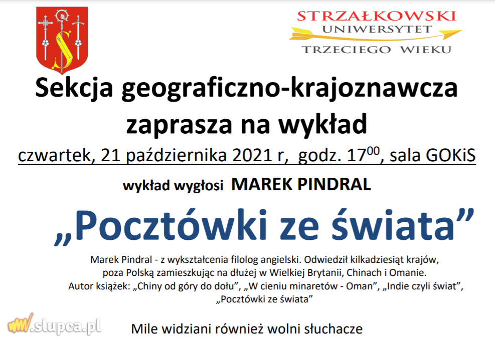 W czwartek, 21 października o godz. 17.00 na sali Gminnego Ośrodka Kultury i Sportu pierwszy w tym roku wykład w ramach sekcji geograficzno-krajoznawczej Strzałkowskiego Uniwersytetu Trzeciego Wieku wygłosi dobrze znany słuchaczom podróżnik Marek Pindral. Szczegóły poniżej. Zdj. oborniki.pl