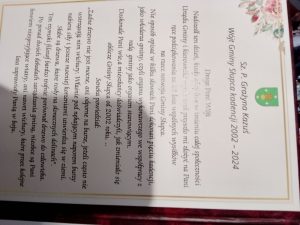 – Szanowni Państwo jest wiele osób, którym chciałabym podziękować za 21,5 roku służby dla naszej gminy. Był to piękny okres. Wszystko co zostało zrobione to dla naszej społeczności. Wierzę, ze gmina dalej będzie się dobrze rozwijać. Dziękuję wszystkim jednostkom podległym, Panu Staroście, paniom dyrektorkom za dobrą współpracę, radnym sołtysom i pracownikom urzędu. Jestem bogata mając tak wspaniałą rodzinę. Dziękuję za wszystko… – powiedziała m.in. Grażyna Kazuś.